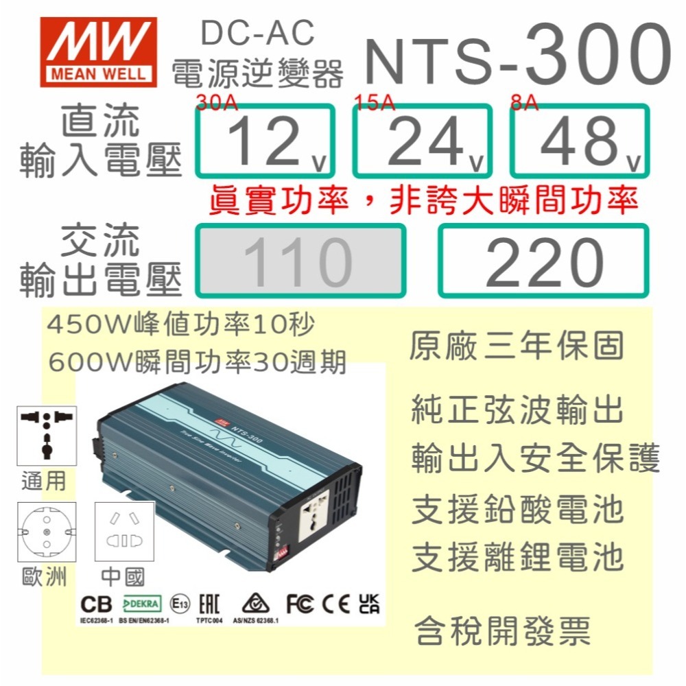 【保固附發票】MW明緯 300W 純正弦波工業級逆變器 NTS-300 12V 24V 48V 轉 220V 直流轉交流