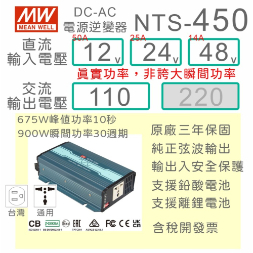【保固附發票】MW明緯 450W 純正弦波工業級逆變器 NTS-450 12V 24V 48V 轉 110V 直流轉交流