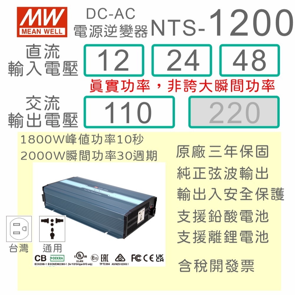 明緯逆變器NTS/NTU-1200有別於一般市售消費性等級,最大特色是採工業級高可靠、高安全性、高品質並融入環保高效能概念設計,且導入全新數位化智能芯片及嚴選用料。主要特點有 : 瞬間功率可達2000W、可彈性自調AC輸出電壓/頻率及節能模式、遠端ON/OFF遙控、多重智能保護(異常自動關機)、可操作於-25~+70℃、歐/美/中國及萬用插皆為標準品有庫存現貨,交期短、通過國際認證及3年長效保固..….等。可使用於家用/辦公室、車用、遊艇、偏遠地區無AC電力網、移動式AC電源、或不斷電系統(NTU系列).….等場合,如 : 驅動電視、電腦、手機充電、音響、照明、電扇、移動式醫用推車…….等。