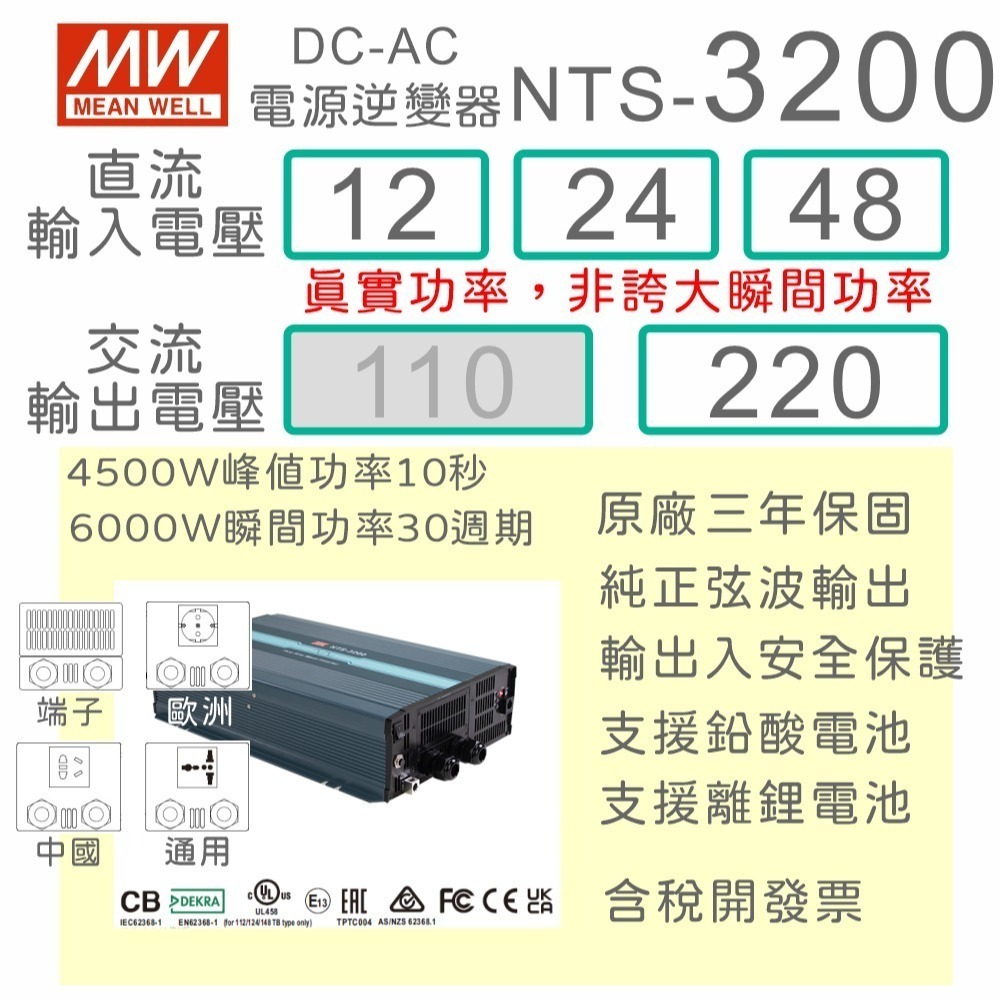 【保固附發票】MW明緯 3200W 純正弦波工業級逆變器 NTS-3200 12V 24V 48V 轉 220V