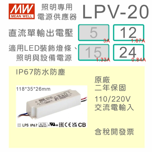 【保固附發票】MW明緯 20W LED Driver 防水電源 LPV-20-12 12V 24 24V 變壓器 燈條