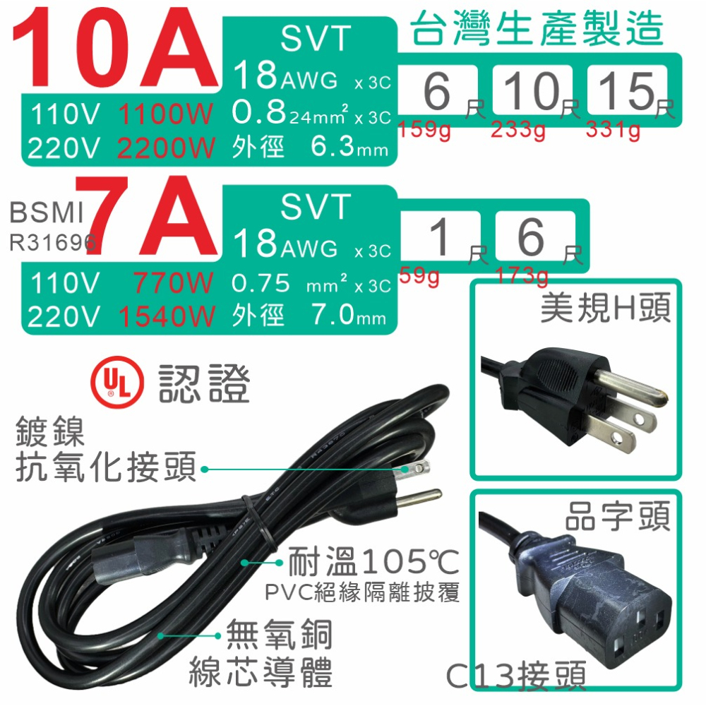【台製附發票】NEMA5-15P IEC C13 3P美規品字電源線 18AWG 10A 6尺 15尺 UL認證 SVT