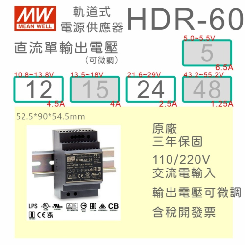 【保固附發票】MW 明緯 60W 導軌式電源 HDR-60-12 12V 24 24V 鋁軌 變壓器 驅動器 AC-DC