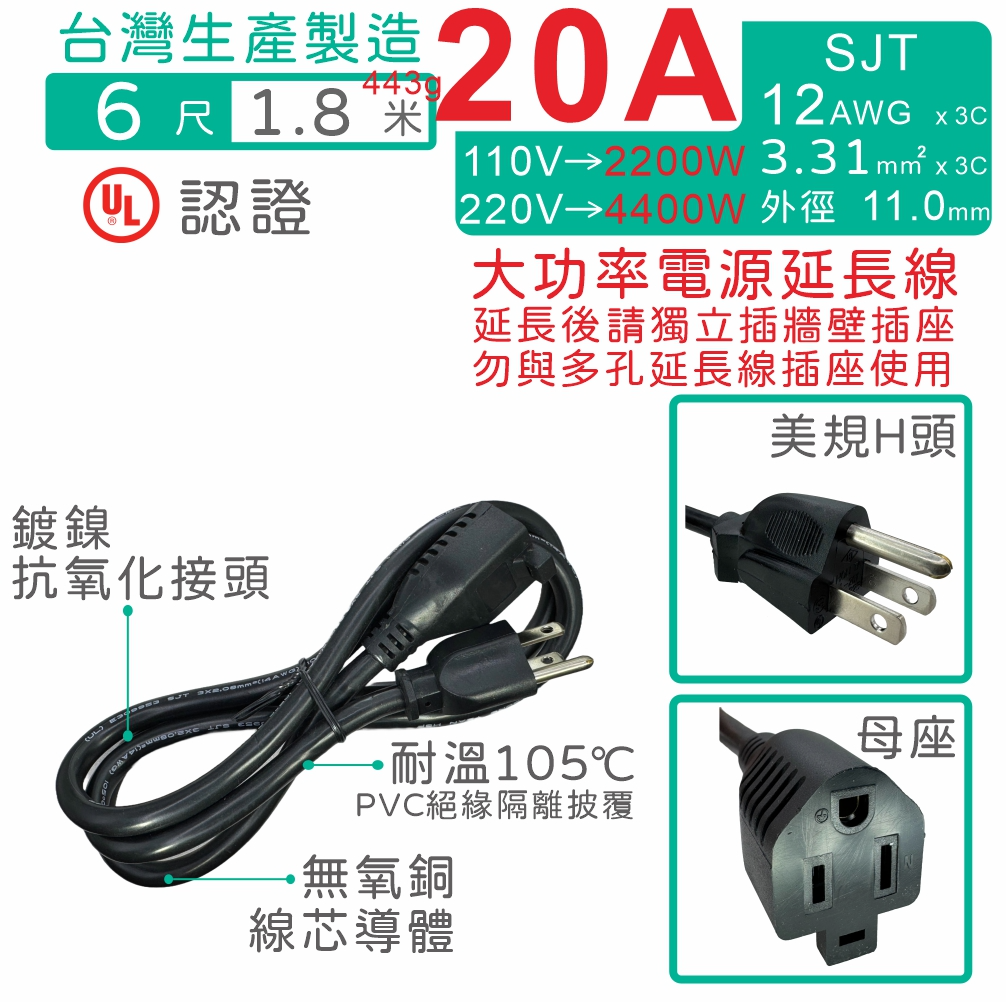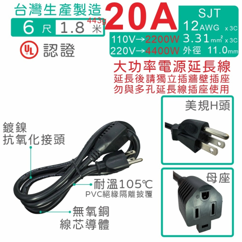【台製附發票】NEMA5-15 3P美規H頭電源中繼延長線 12AWG 20A 大電流 6尺(1.8公尺) UL