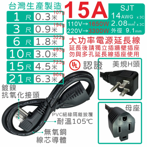 【台製附發票】NEMA5-15 3P美規L型H頭電源中繼延長線 14AWG 15A大電流 1/2/4/6/10尺 UL