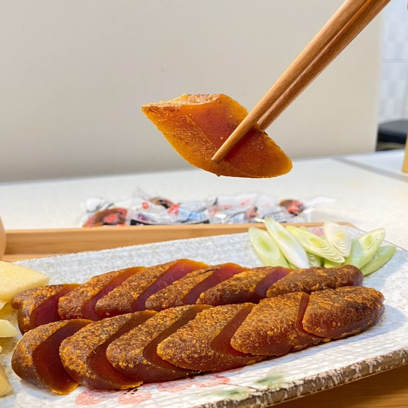 整塊烏魚子大刀切片,使用一口吃真空包裝,方便保存與同親友分享,開封即可享用 ,海味濃郁,口感Q嫩的烏魚子吧!