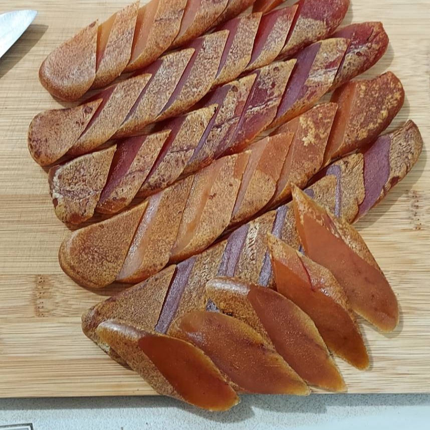 整塊烏魚子大刀切片,使用一口吃真空包裝,方便保存與同親友分享,開封即可享用 現在就來嚐嚐這鮮而不鹹,海味濃郁,口感Q嫩的烏魚子吧!