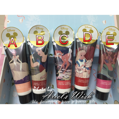 迪士尼護手霜系列!!!! ----韓國製---- 20g,高約11.5㎝ A---灰姑娘仙杜瑞拉款-(蜂蜜香味) B-白雪公主款-(玫瑰香味) C-小鹿斑比Bambi款-(櫻花香味) D-愛麗絲Alice款-(櫻花香味) E-小美人魚Ariel款-(櫻花香味) A~E現貨各一個在台,韓國製造,請把握機會唷。請先留言詢問是否還有唷,商品售出斷貨速度我們無法控制唷,如遇缺貨等無法控制之情形請您務必見諒與理解唷,謝謝您^~^ |