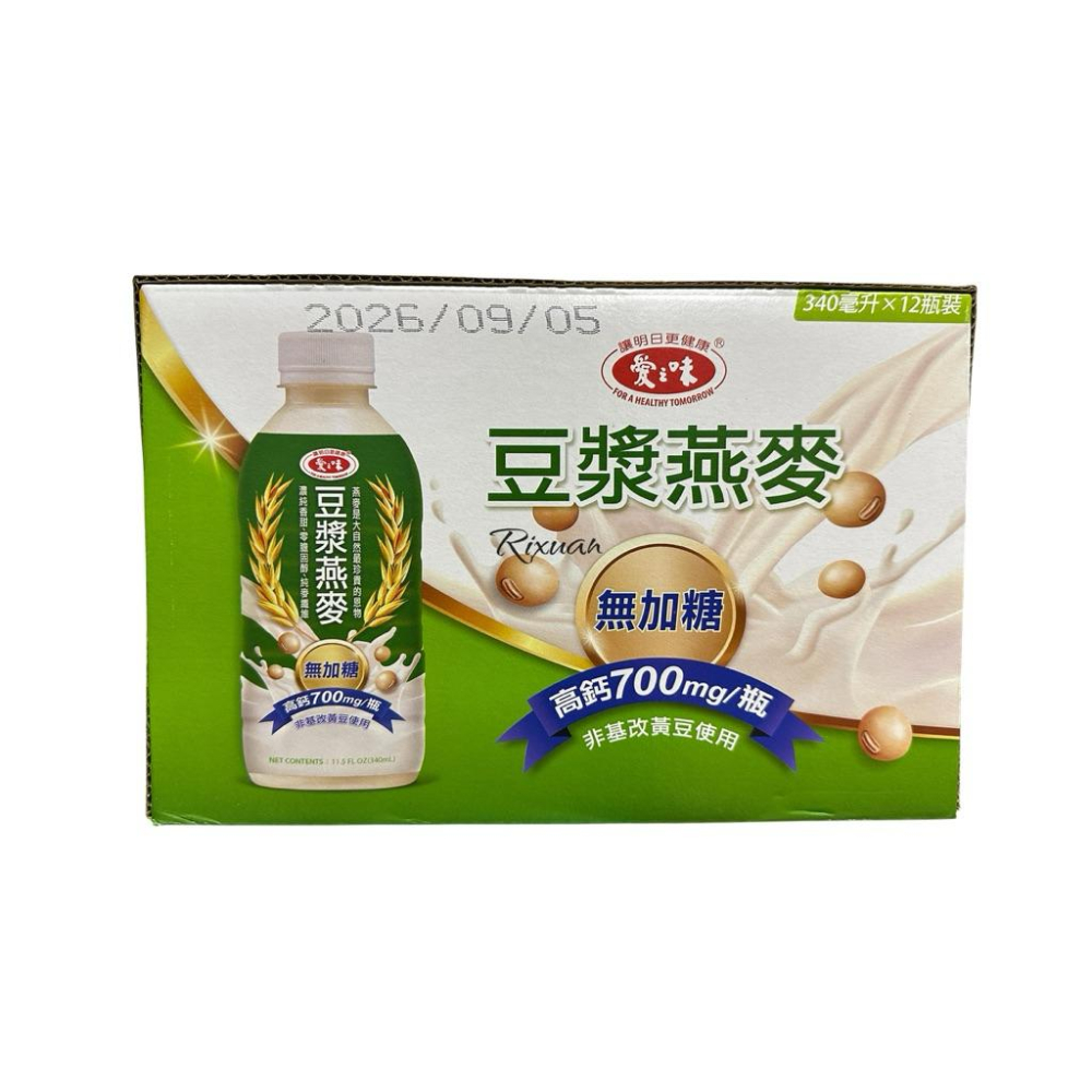 商品規格: 品名 : 愛之味豆漿燕麥 340毫升 X 12 入 外箱尺寸 : 長 37公分 X 寬 20公分 X 高 22公分 內容量/入數 : 340毫升/12入 商品容量 : 4.08公升 商品重量 : 4.7公斤 商品尺寸 : 長 26.5公分 X 寬 19.5公分 X 高 17公分 成分 : 水、燕麥、豆漿粉[大豆(非基因改造)、碳酸氫鈉]、芥花油(非基因改造)、碳酸鈣、碳酸氫鈉(小蘇打) 保存方式 : 常溫保存,開瓶後請冷藏,並儘速飲用完畢 保存期限 : 以消費者收受日起算,至少距有效日期前80日以上 產地 : 臺灣 食品業登錄字號 : Q-165534366-00000-2 產品責任險契約字號 : 1501字第09PD01649號 製造/進口商名稱 : 愛之味股份有限公司 製造/進口商電話 : 0800-420168 製造/進口商地址 : 嘉義縣民雄鄉興南村工業二路11號 注意事項 : 1. 本產品使用燕麥製造,產品若有脂肪上浮、沉澱或變深情形,請搖勻飲用。 2. 請勿置於陽光直射處或高溫場所及避免碰撞。 3. 開瓶後請冷藏,並建議於 4 小時內飲用完畢。 4. 建議飲用量:每日建議攝取 680mL,可依個別需要調整。 5. 注意事項:每日請勿飲用超過 680mL,以免引起脹氣。 6. 本產品含有麩質蛋白(燕麥來源)、大豆。 7. 本生產線亦生產含花生、牛奶、魚類、堅果類、芝麻及其製品 品牌 : 愛之味
