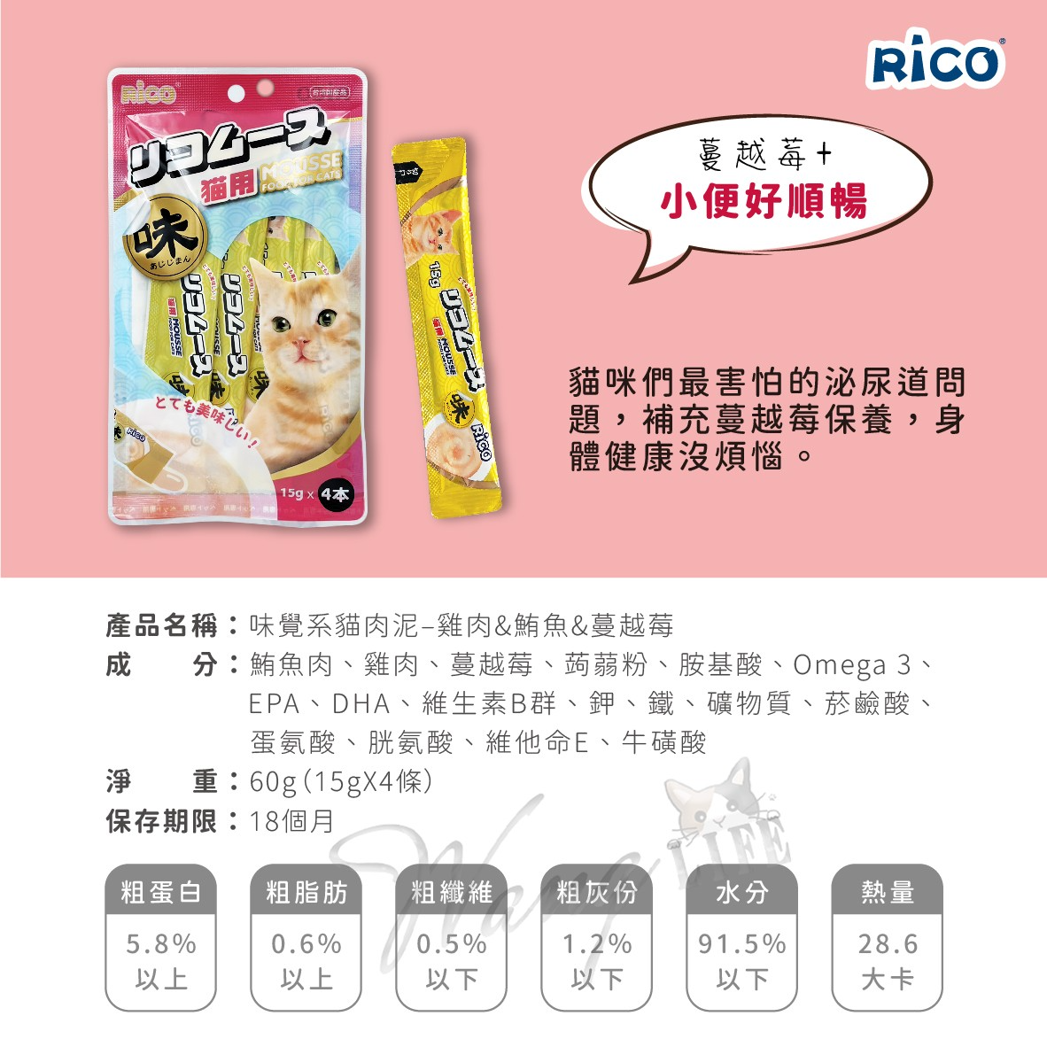 🐟【鮪魚&雞肉底+營養配方】這款貓肉泥以鮪魚和雞肉為底,搭配多種營養配方,包括卵磷脂、葡萄糖胺、蔓越莓和魚油等。這些成分提供了豐富的Omega 3脂肪酸、維生素B群、礦物質和其他營養素,有助於支持貓咪的皮膚健康、關節保養、泌尿道健康和整體營養補給。