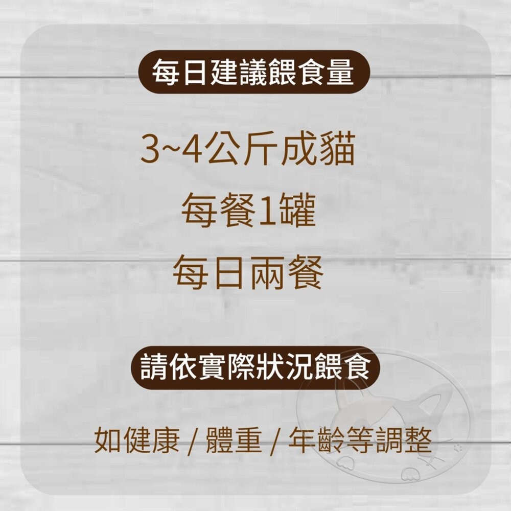 🔸每日建議餵食量:3~4公斤成,每餐1/2罐,每日兩餐(請依實際狀況餵食:如健康、體重、年齡等調整)