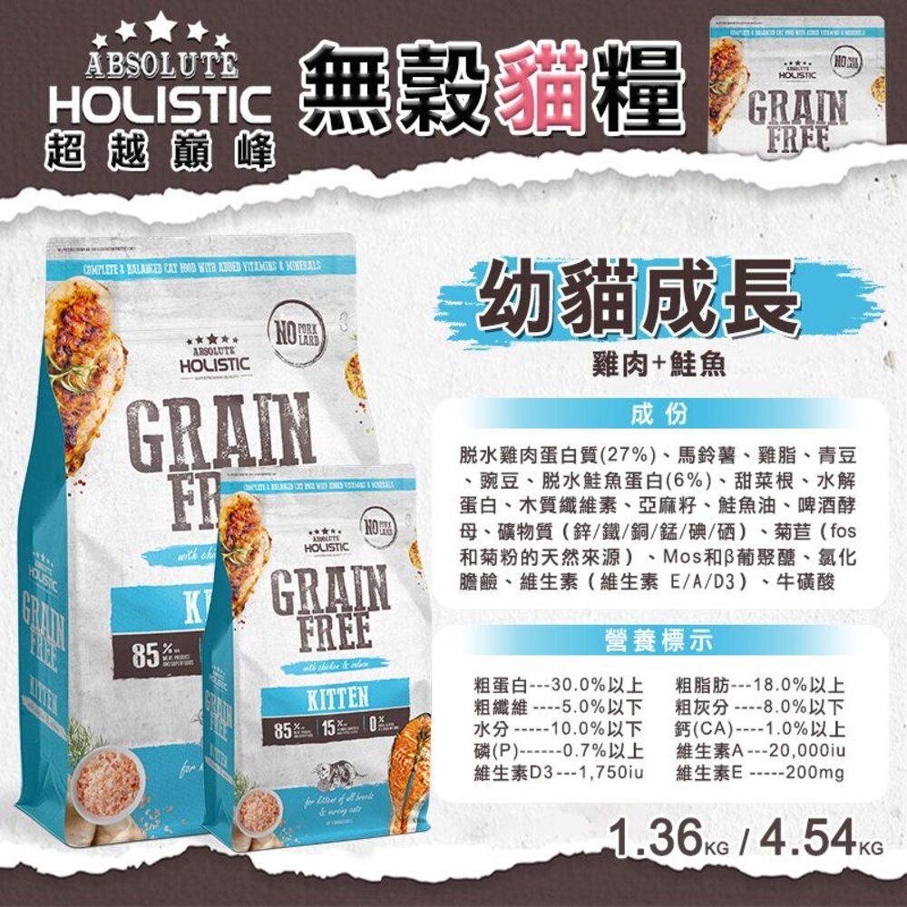 商品名稱:ABSOLUTE HOLISTIC 超越巔峰 無穀貓糧 4.54kg 低敏 貓飼料