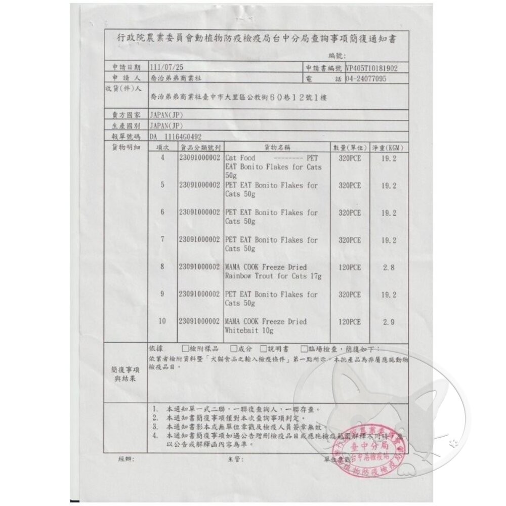 營養成份:蛋白質4.0%以上,脂肪0.2%以上,粗纖維0.1%以下,灰分1.8%以下,水分93.5%以下,熱量大約11kcal/袋