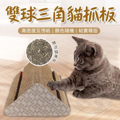 商品名稱:雙面單槽三角瓦楞貓抓板 寵物玩具 雙邊鈴鐺球設計 貓抓 三角貓抓板