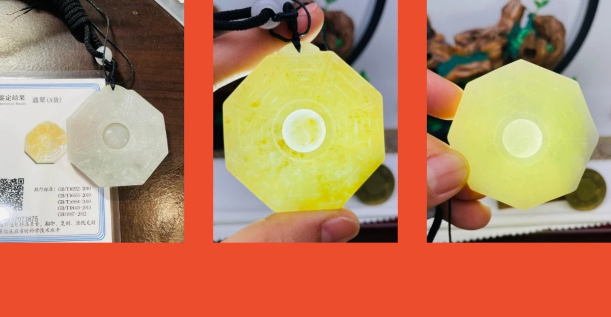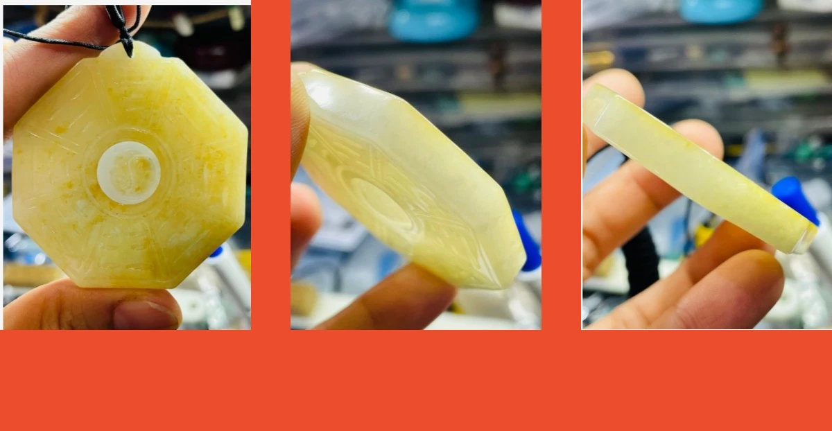 去蕪存菁保留完美霧層冰黃色滿油亮亮 白肉起冰細潤 天然過渡無燒色 厚庄大塊有分量 太極能動 無紋裂摳 雕工無暇
