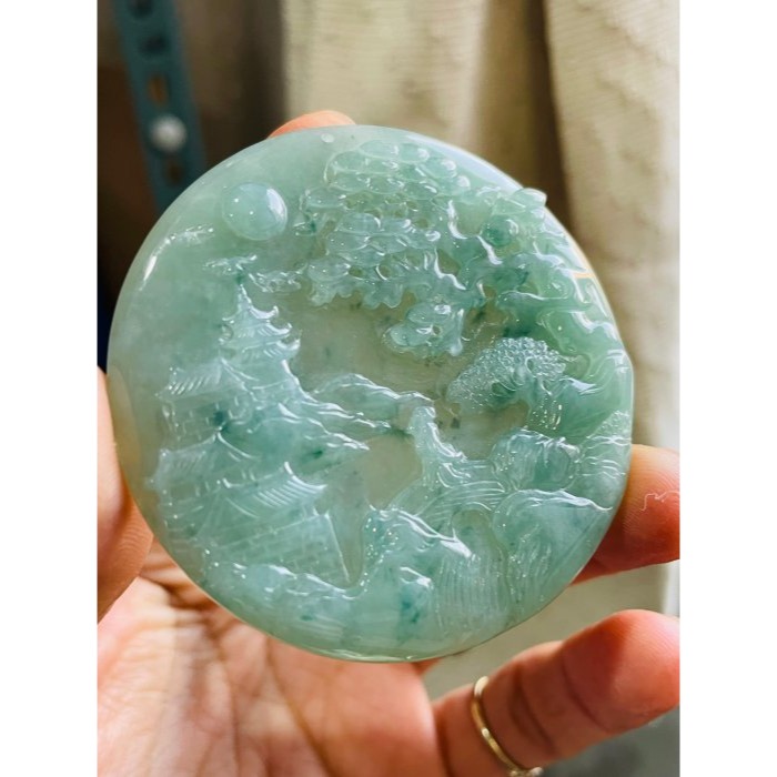 高貨冰綠鐲心完美度佳採淺浮雕工無避裂雕 完美一刀切正圓牌形