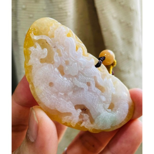 油亮冰黃霧色滿起冰成色飽和 厚度不薄巧雕滿版金鳳凰 冰淡紫肉俏一抹淡綠巧雕有首有尾全龍