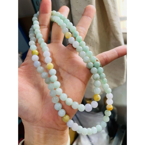商品狀況:冰糯種 冰潤淡綠底色 種老肉細水潤 集結多色度綠珠 有水頭淡綠 也有白冰