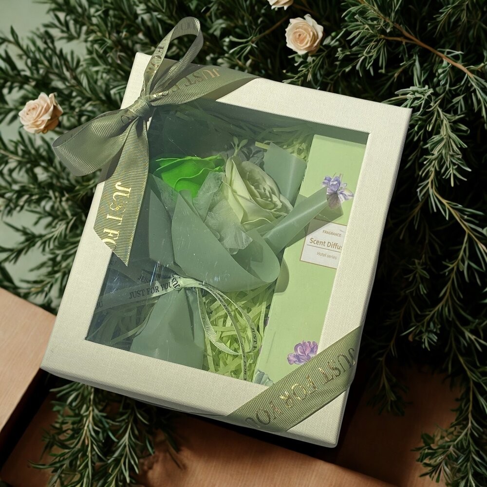 內含擴香芬、擴香棒、香皂花束,搭配乾燥花飾品與高質感包裝,開盒即感受幸福。