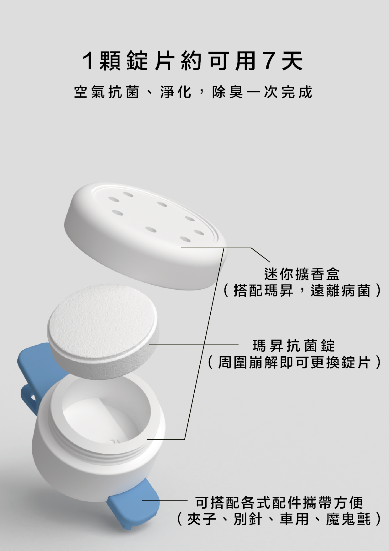 1.將1片錠片放入專利容器-MAVO迷你擴香盒內,轉緊蓋子即可使用,