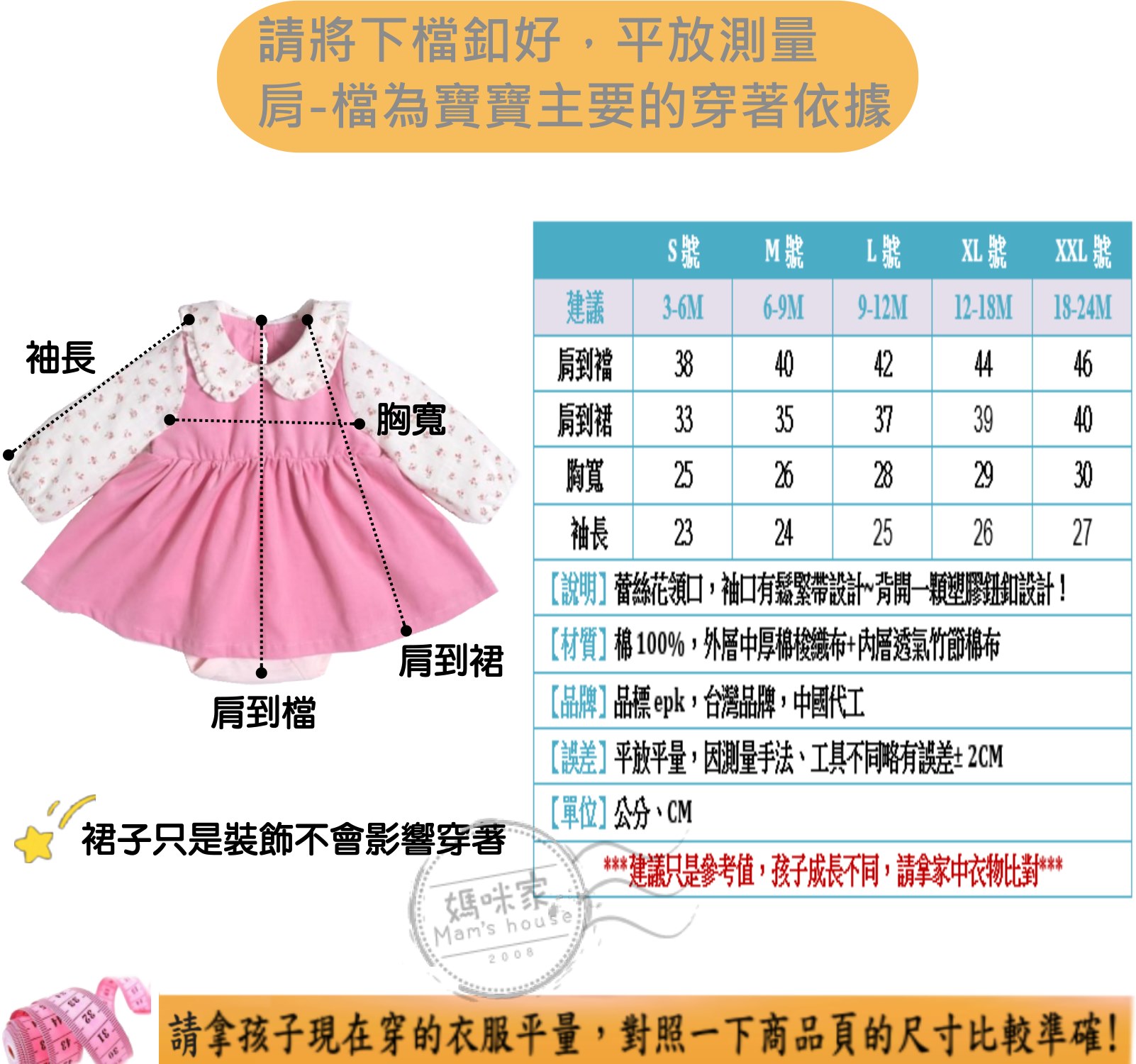 ◆包屁跨下按扣+裙哈設計,方便穿脫方便更換尿布!