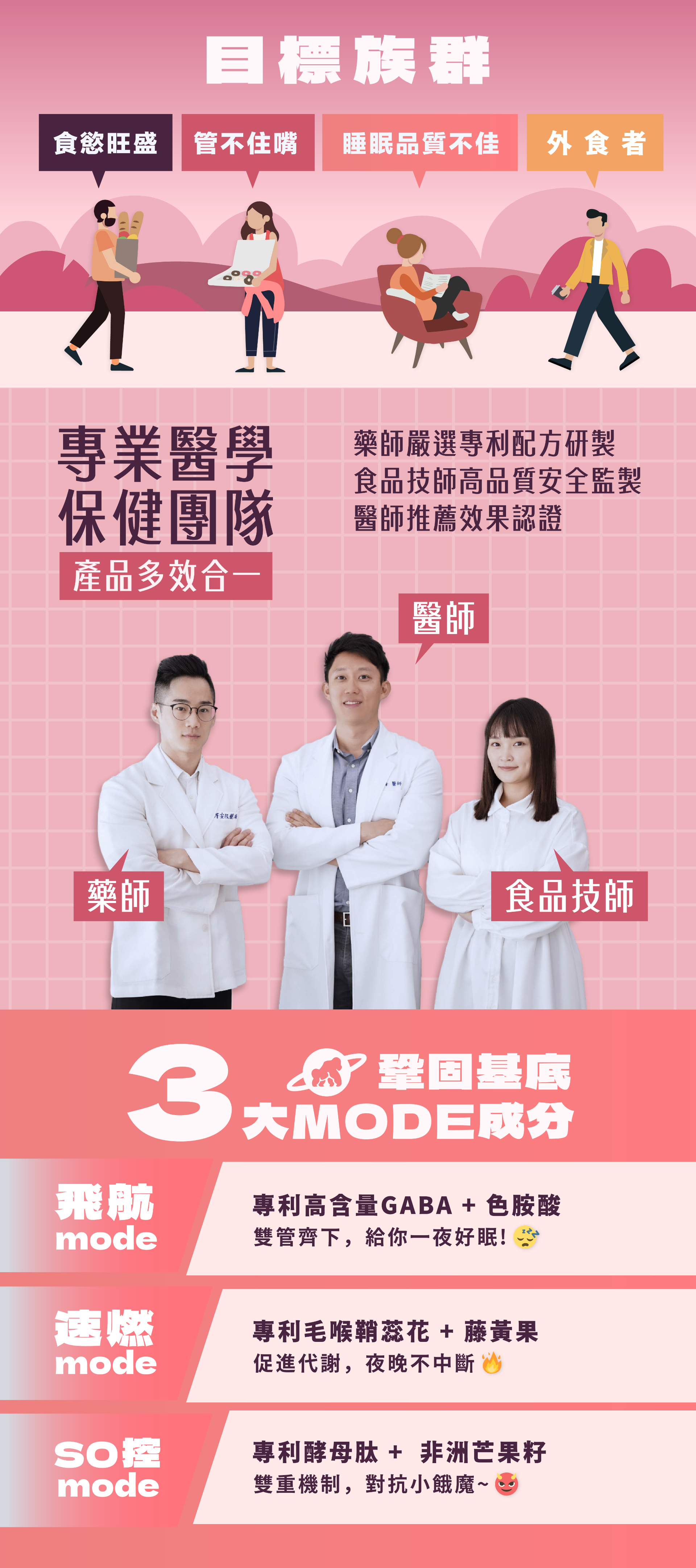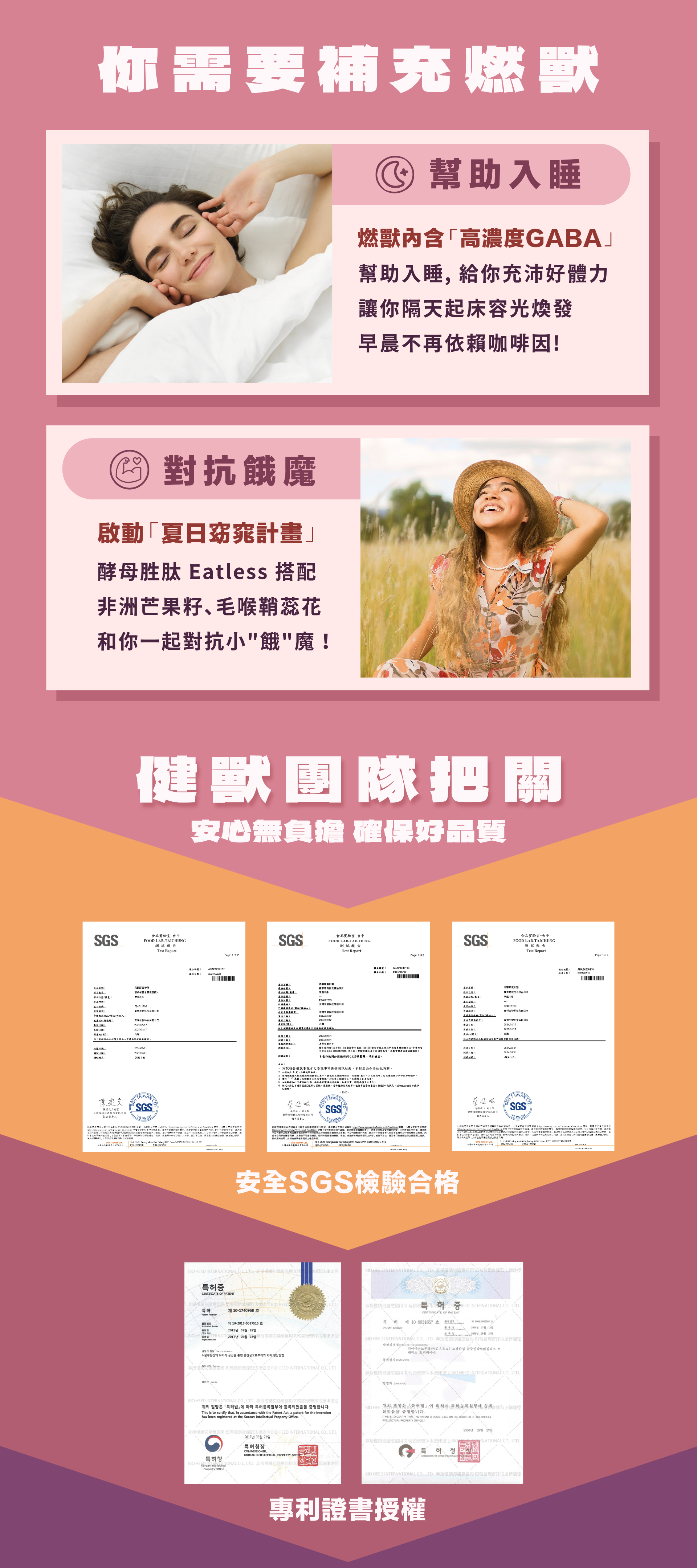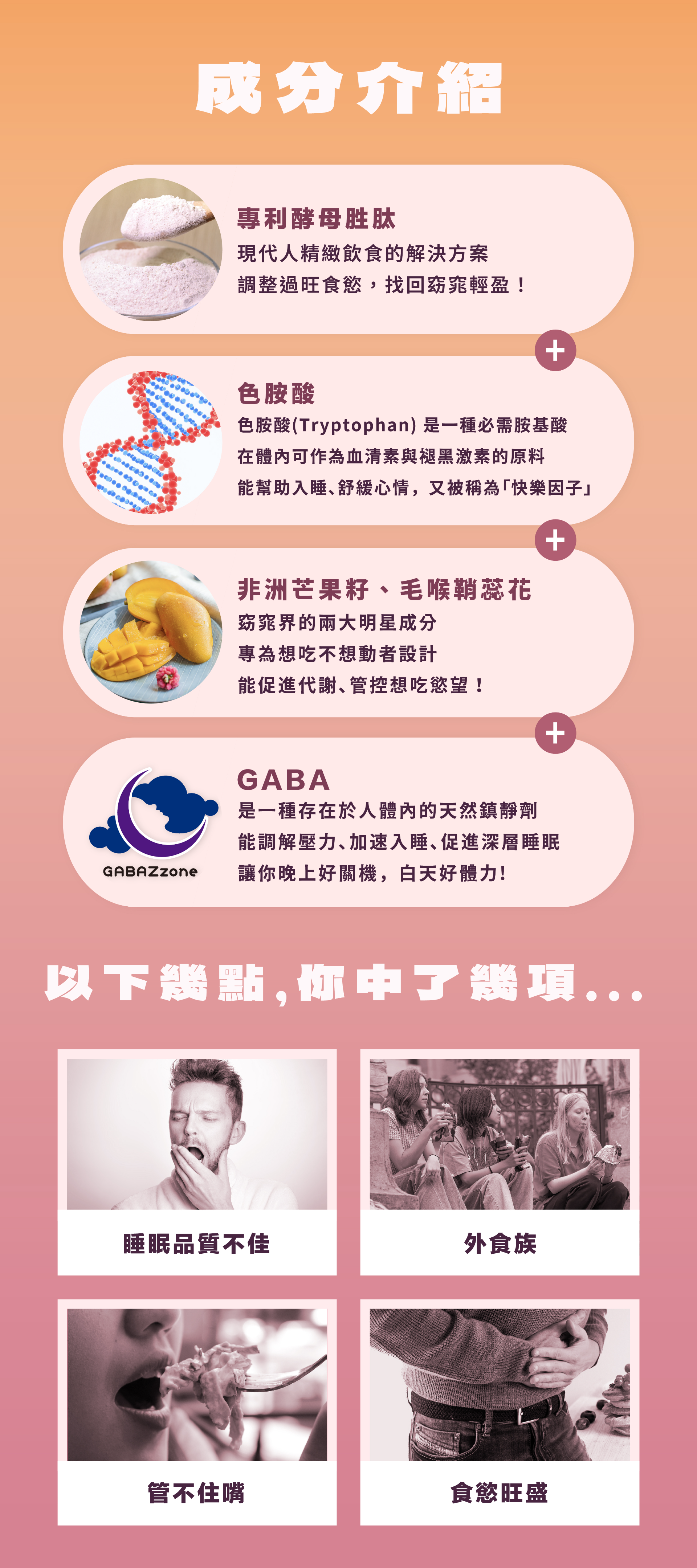 成 分:麩胺酸發酵物 (糊精、專利麩胺酸發酵物 (含 GABA))、綜合胺基酸 (L - 精胺酸、鹽酸 L - 二胺基己酸、L - 異白胺酸、L-α 胺基異戊酸、L - 白胺酸)、毛喉鞘蕊花萃取 (麥芽糊精、專利毛喉鞘蕊花萃取物)、啤酒酵母水解物 (啤酒酵母水解物 (含專利酵母胜肽)、糊精)、磷酸鈣、麥芽糊精、非洲芒果種子萃取 (非洲芒果種子萃取物、麥芽糊精)、L - 酒石酸肉酸
