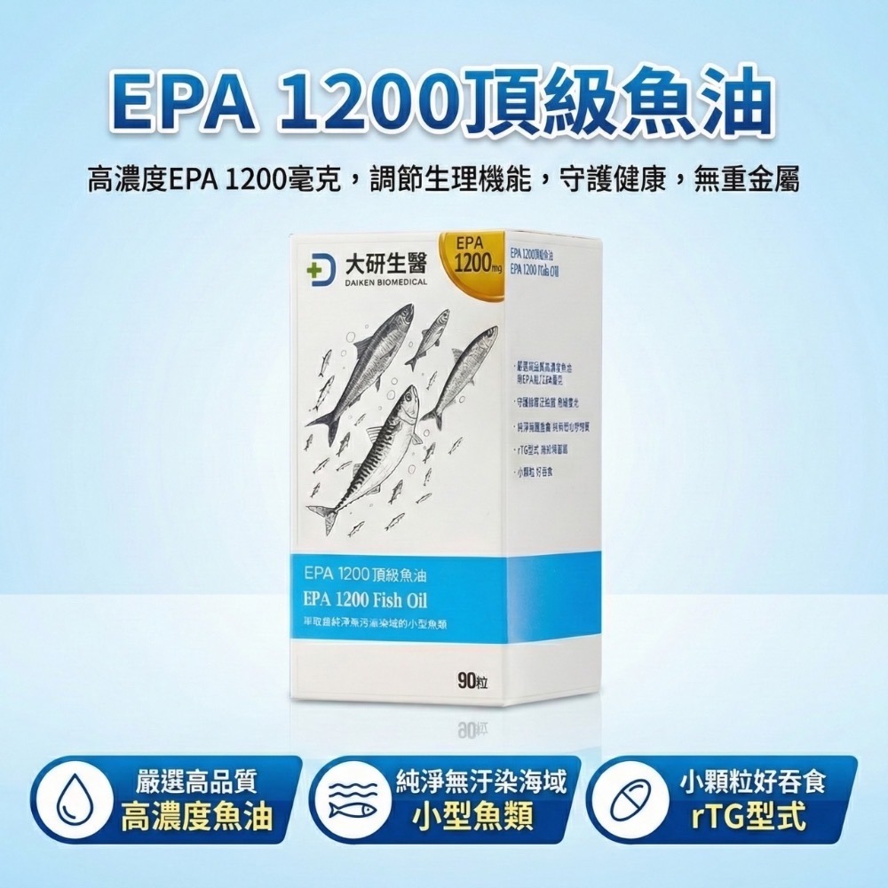 如果您是需要加強補充 EPA 的族群,「EPA 1200 頂級魚油軟膠囊」(封面四隻魚) 就非常適合您,此款為迷你膠囊,非常適合不擅長吞膠囊的朋友,每份 EPA 高達 1200 毫克
