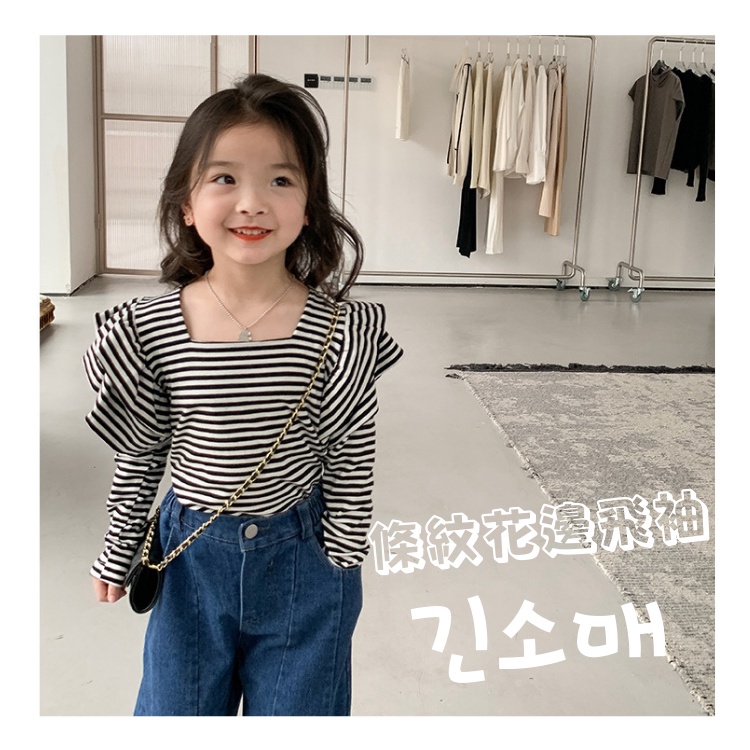 韓系方領條紋氣質花邊飛袖上衣