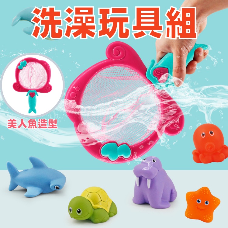 商品名稱:感溫變色美人魚洗澡玩具組(含一支美人魚魚網+六隻海洋動物)