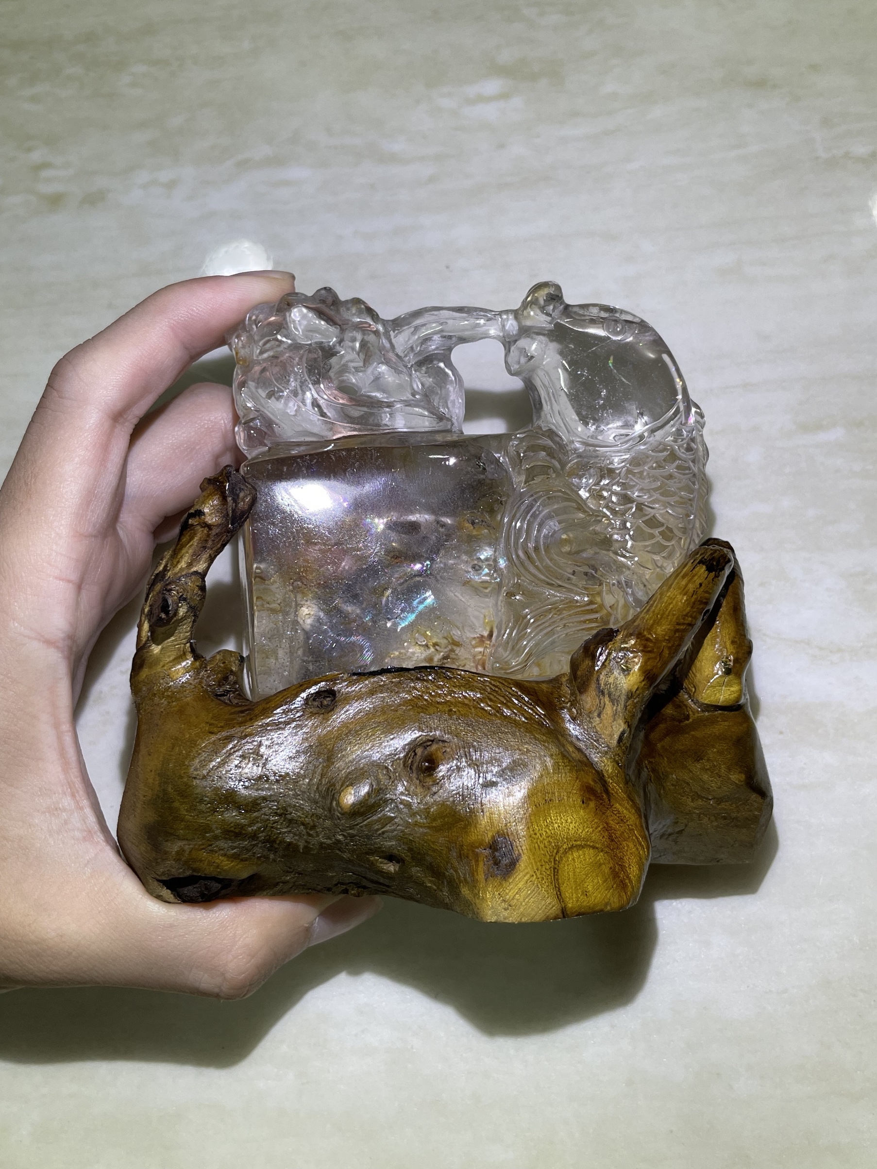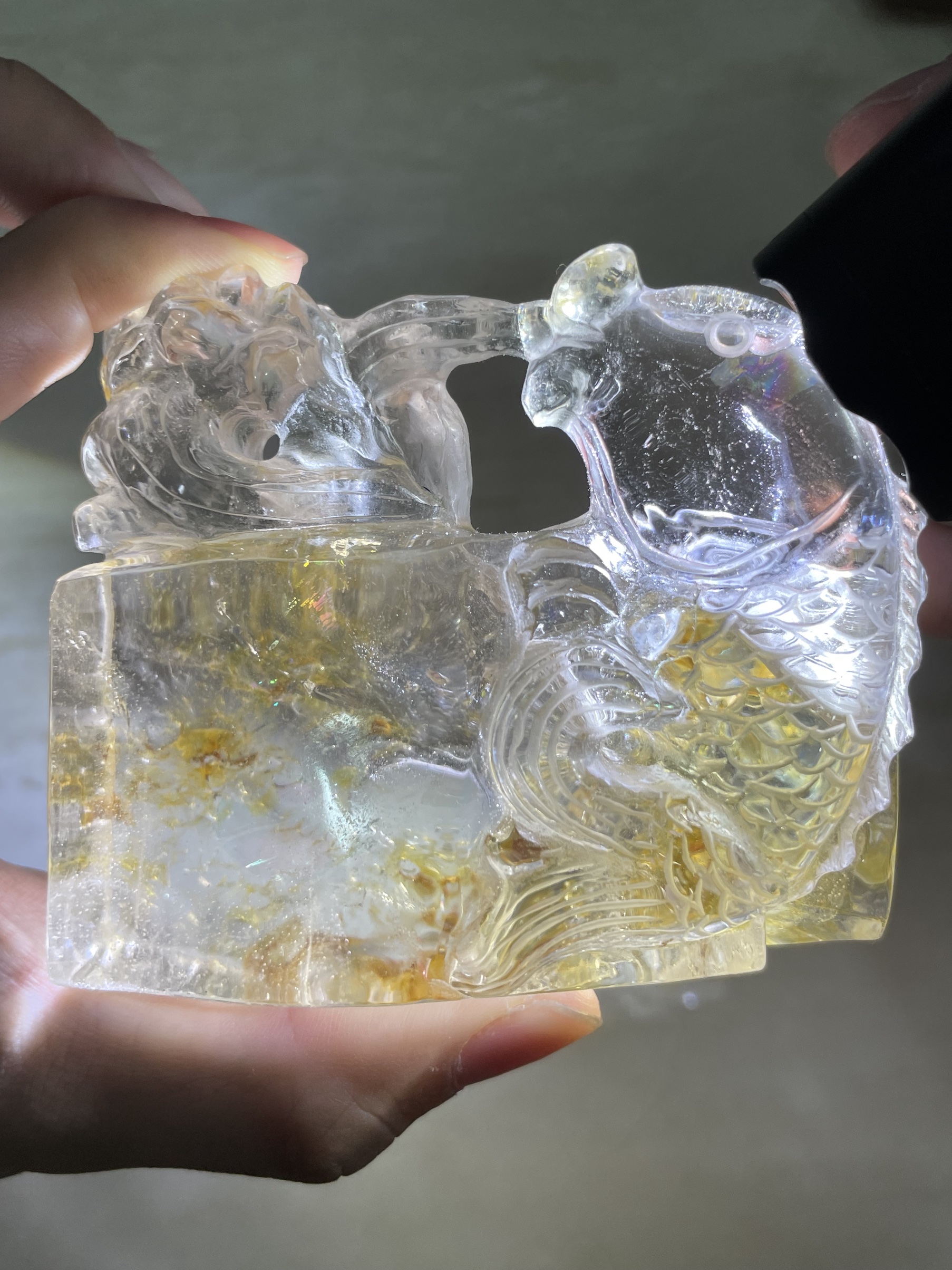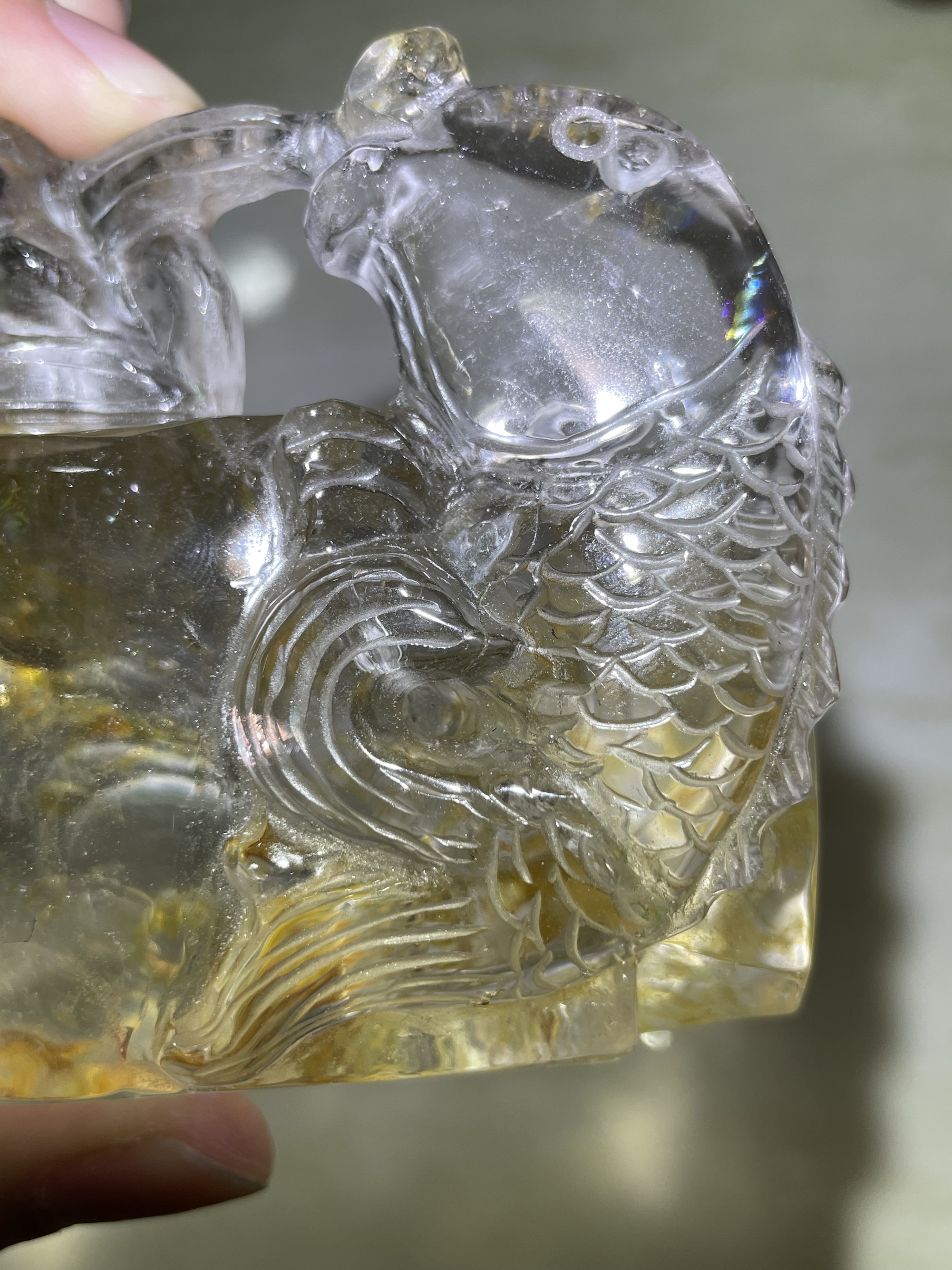 黃膠花 黃膠花水晶 鯉魚 景石 年年有餘 招財開運擺件 附根雕座 贈葫蘆鑰匙圈