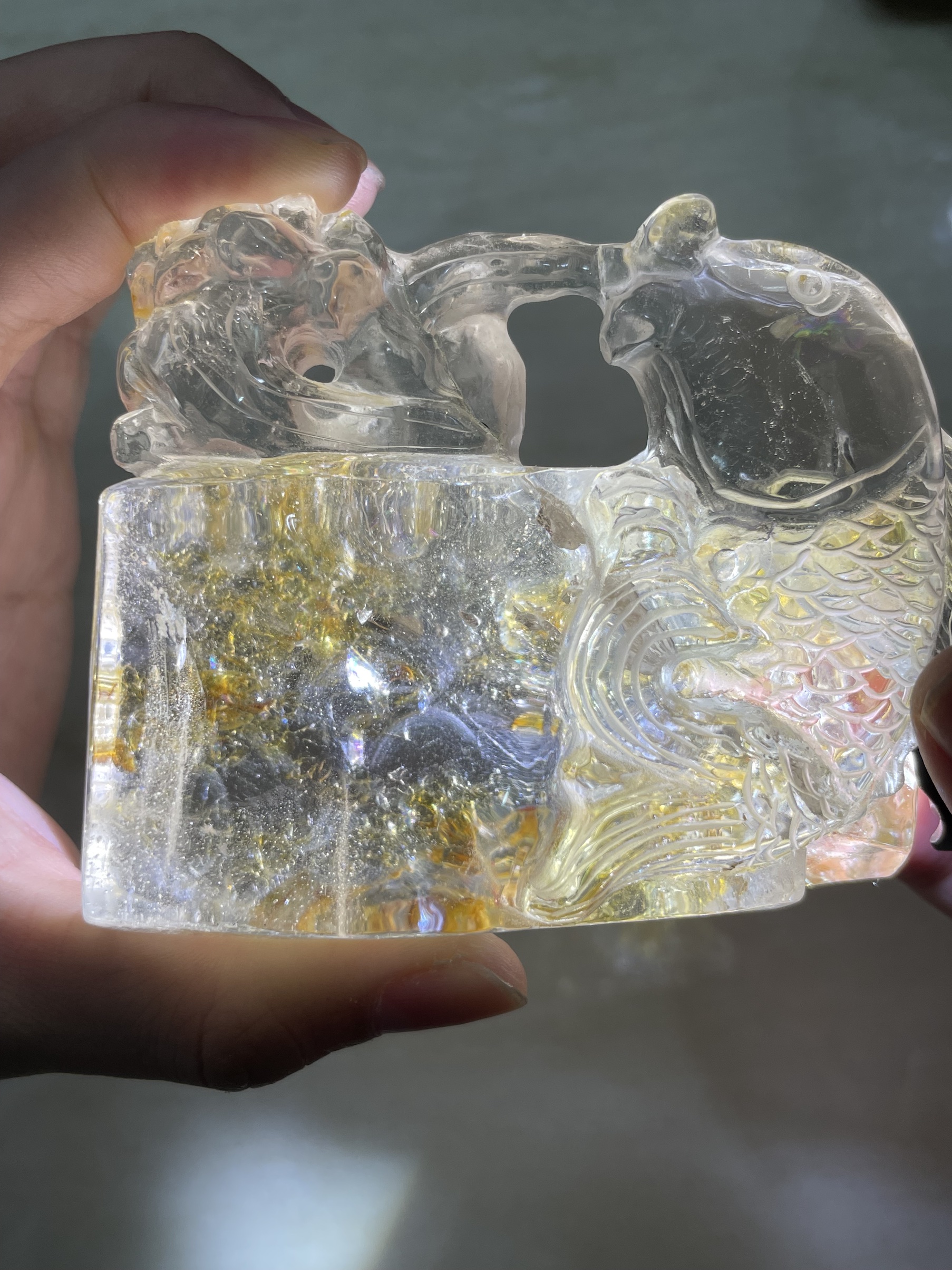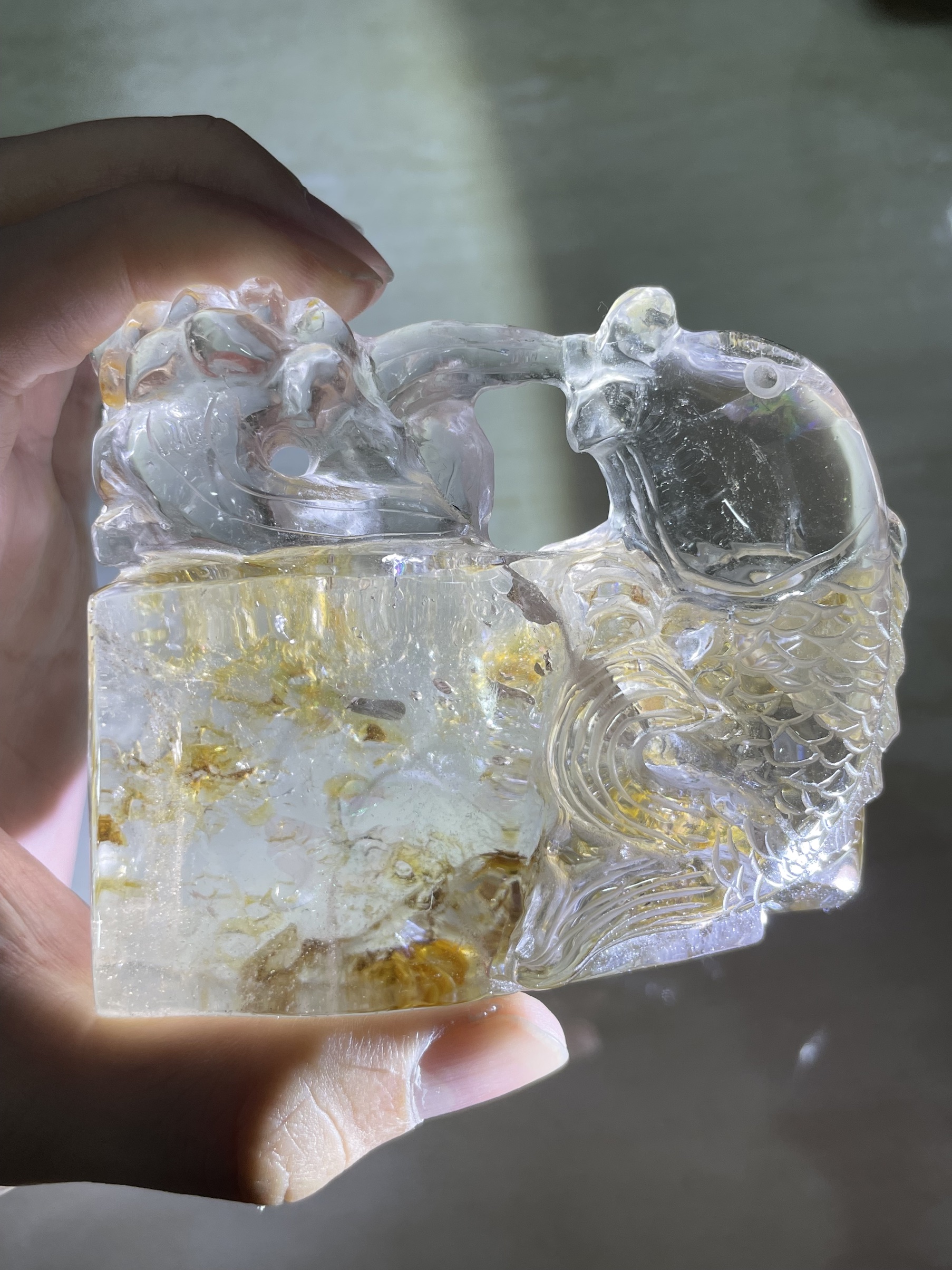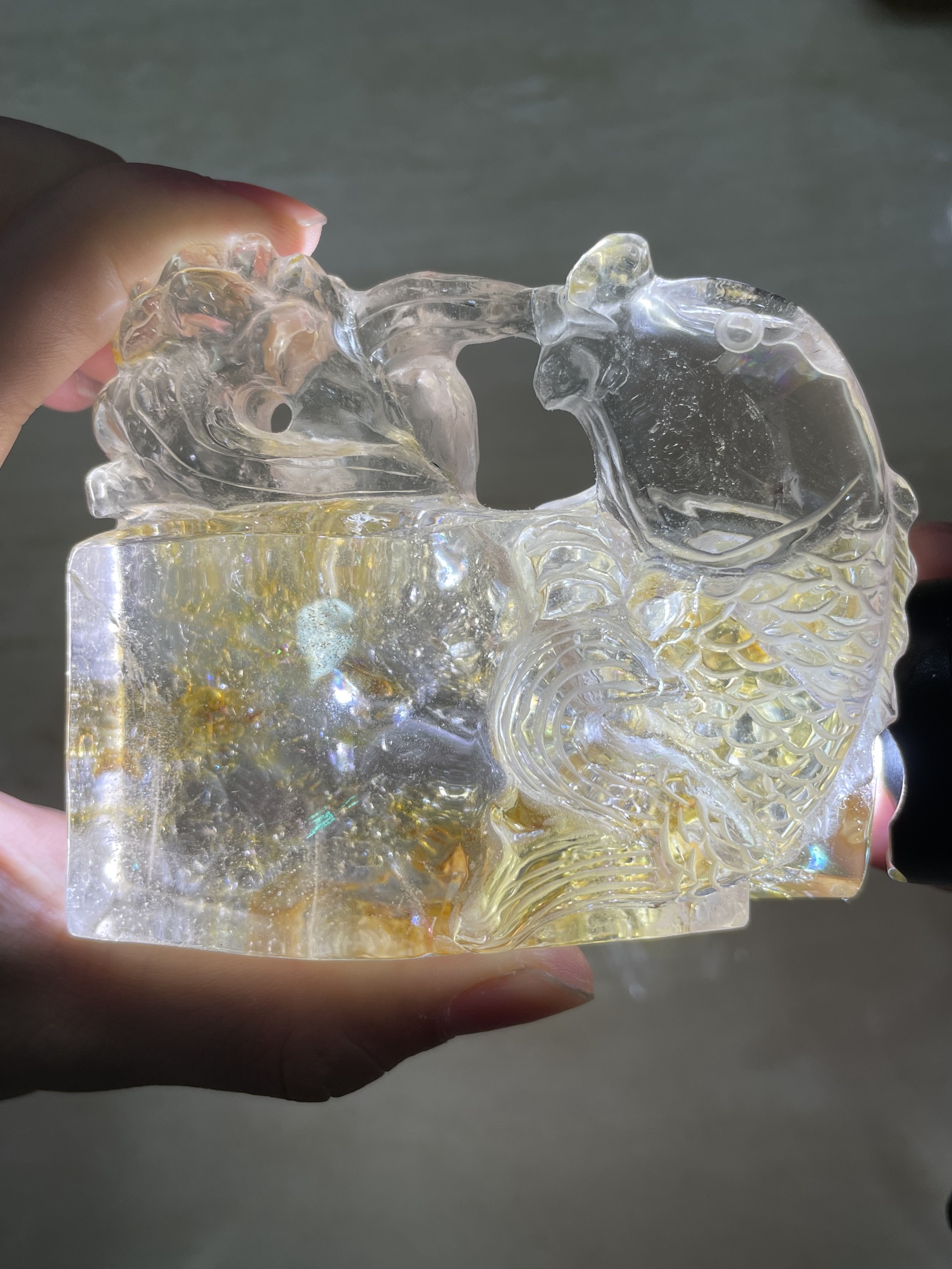 黃膠花 黃膠花水晶 鯉魚 景石 年年有餘 招財開運擺件 附根雕座 贈葫蘆鑰匙圈