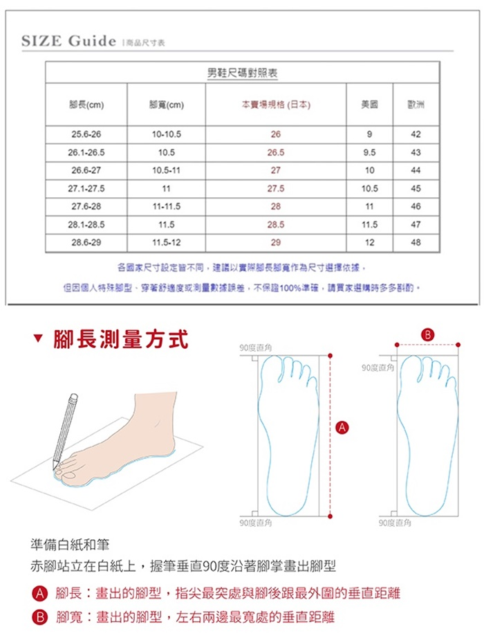 我們的正常版型鞋款:鞋碼 = 公分,建議您先測量實際腳長再選購會較準確,