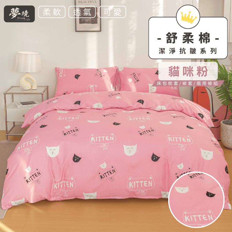 【夢境】MIT 舒柔棉床包組 床包枕套 被套 鋪棉兩用被組 - 貓咪粉