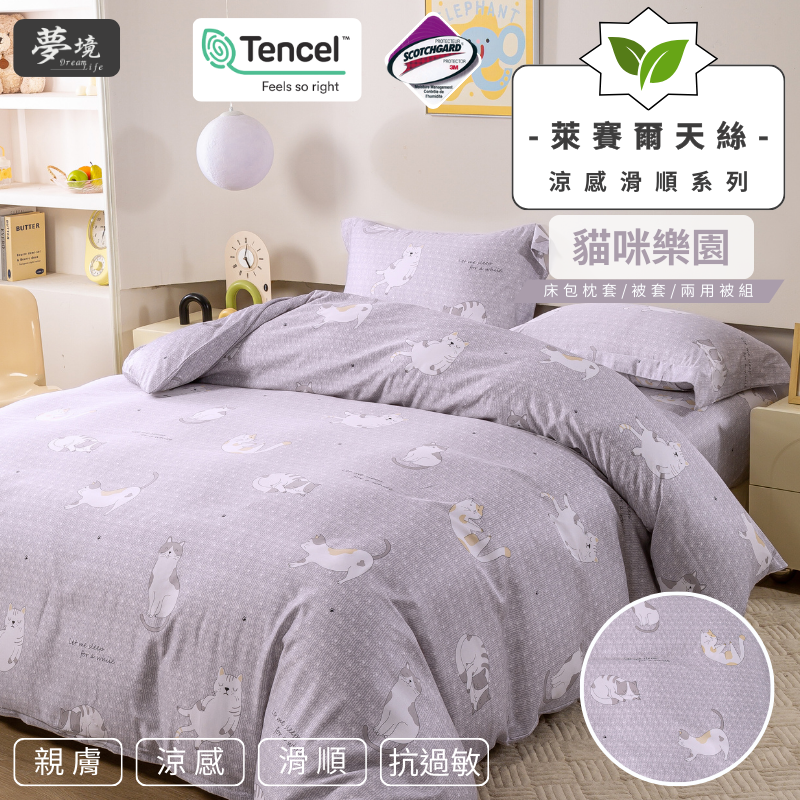 【夢境】MIT 天絲床包組 x 3M吸濕排汗 床包枕套 被套 鋪棉兩用被組 - 貓咪樂園