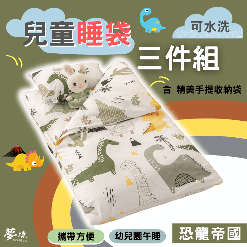 【夢境】兒童睡袋 三件組 幼稚園午睡首選 舒柔棉/睡墊/睡袋/2-8歲/快速收納/方便攜帶 - 恐龍帝國