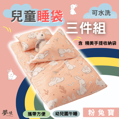 【夢境】兒童睡袋 三件組 幼稚園午睡首選 舒柔棉/睡墊/睡袋/2-8歲/快速收納/方便攜帶 - 粉兔寶