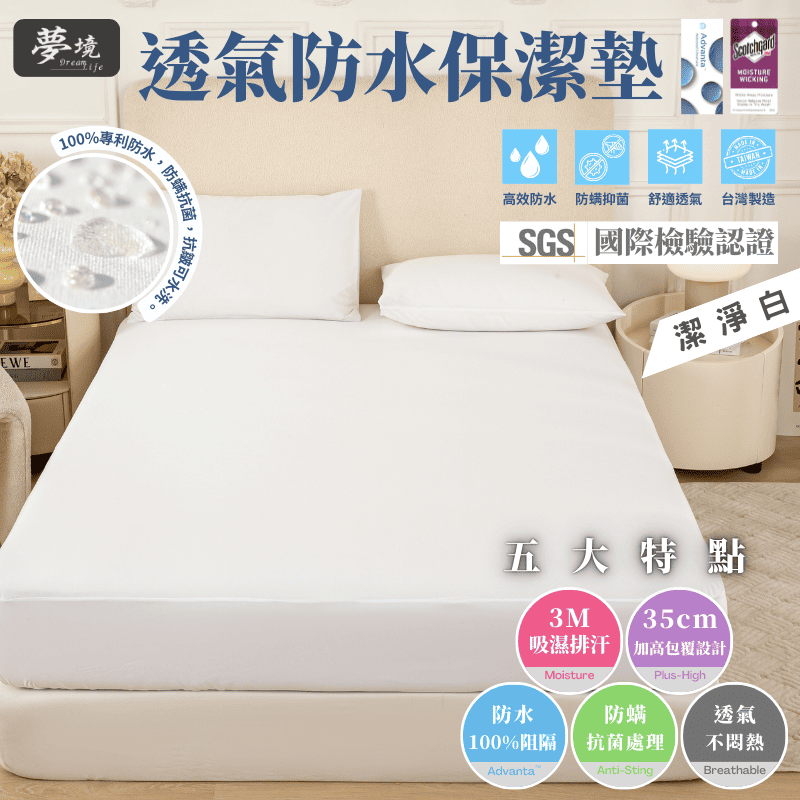 【夢境】MIT 100% 防水保潔墊 x 3M吸濕排汗專利技術 床包式/防水床包/戒尿布/老人/幼童 - 潔淨白
