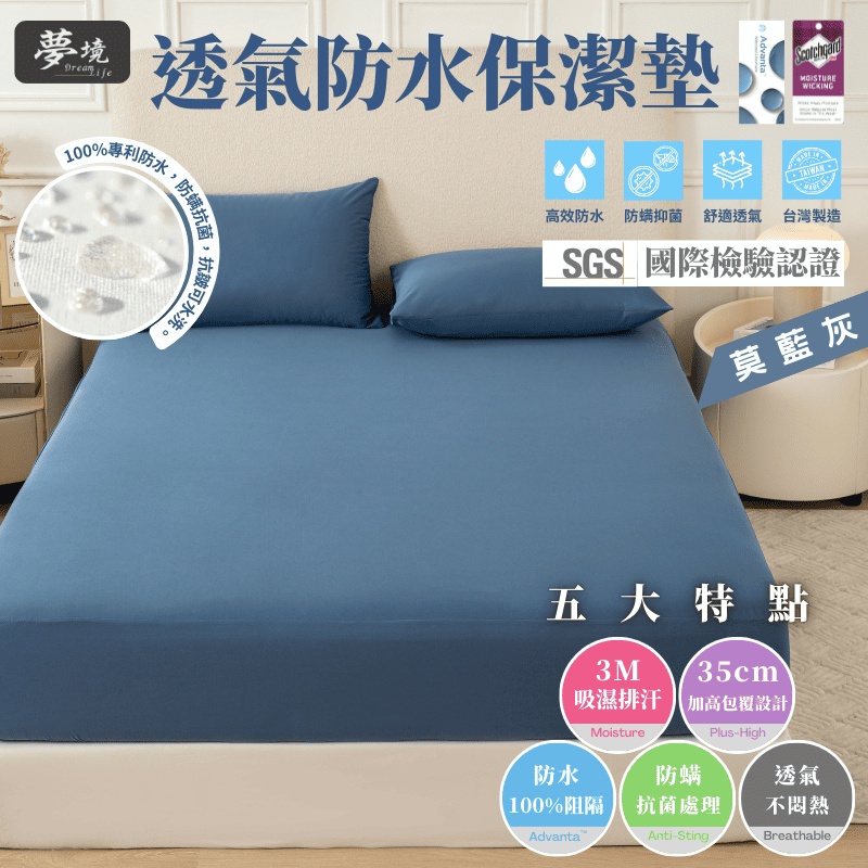 【夢境】MIT 100% 防水保潔墊 x 3M吸濕排汗專利技術 床包式/防水床包/戒尿布/老人/幼童 - 莫藍灰
