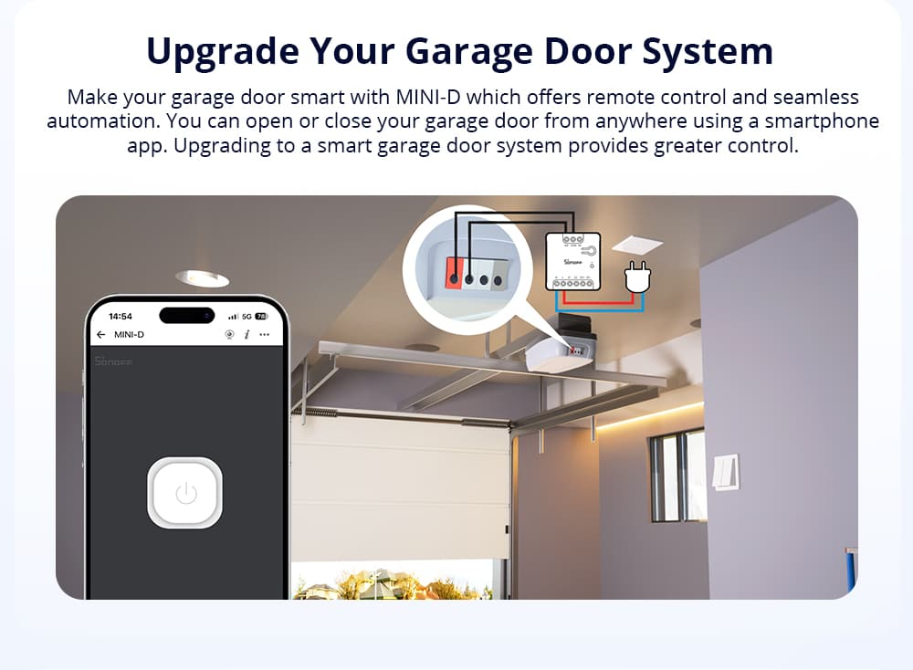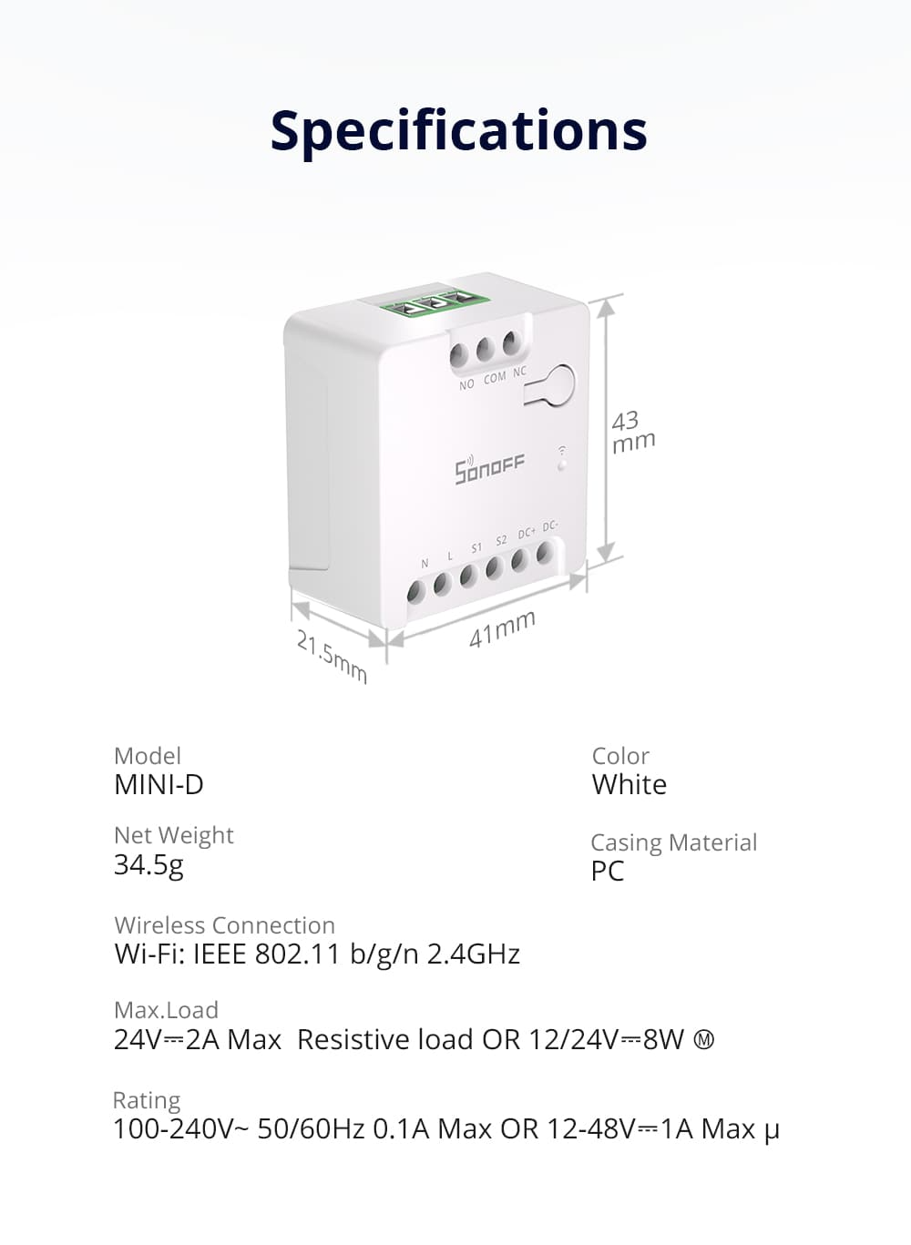 Q:MINI-D 是什麼類型的智能開關? A:MINI-D 是一款支援 Wi-Fi 的乾接點智能開關,專為控制電動馬達、車庫門、鍋爐、電磁閥等需要乾接點訊號觸發的設備所設計。透過 eWeLink App 可實現遠端控制、語音控制、定時、場景聯動等功能。