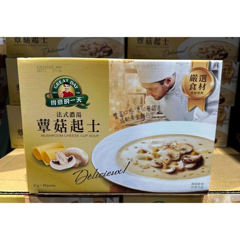 使用方式:只須倒入杯中,加入180c.cc的熱開水,充分攪拌,即可享用一杯健康美味的得意的一天法式蕈菇起士濃湯