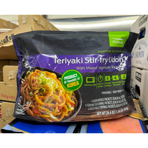 組成有烏龍麵、照燒調味粉、乾燥蔬菜包,4包入,原產地:南韓。將烏龍麵放入油加熱後,加20CC水,撒上乾燥蔬菜,翻炒後再加照燒調味。