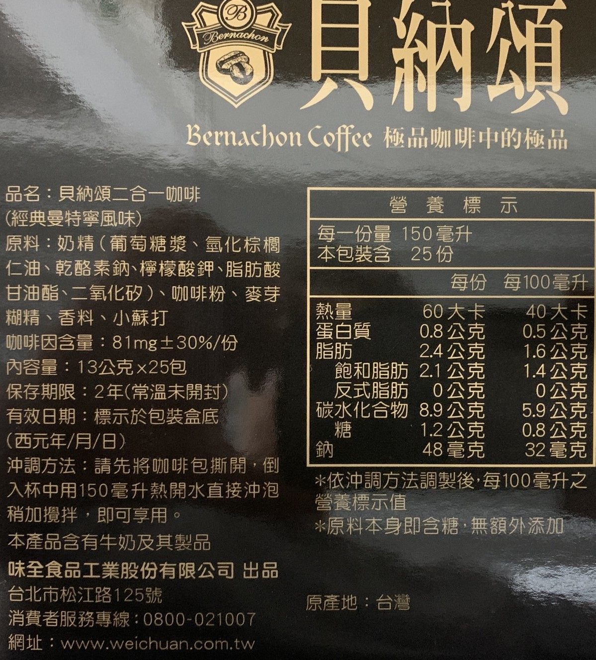 【品名】貝納頌 二合一經典曼特寧咖啡