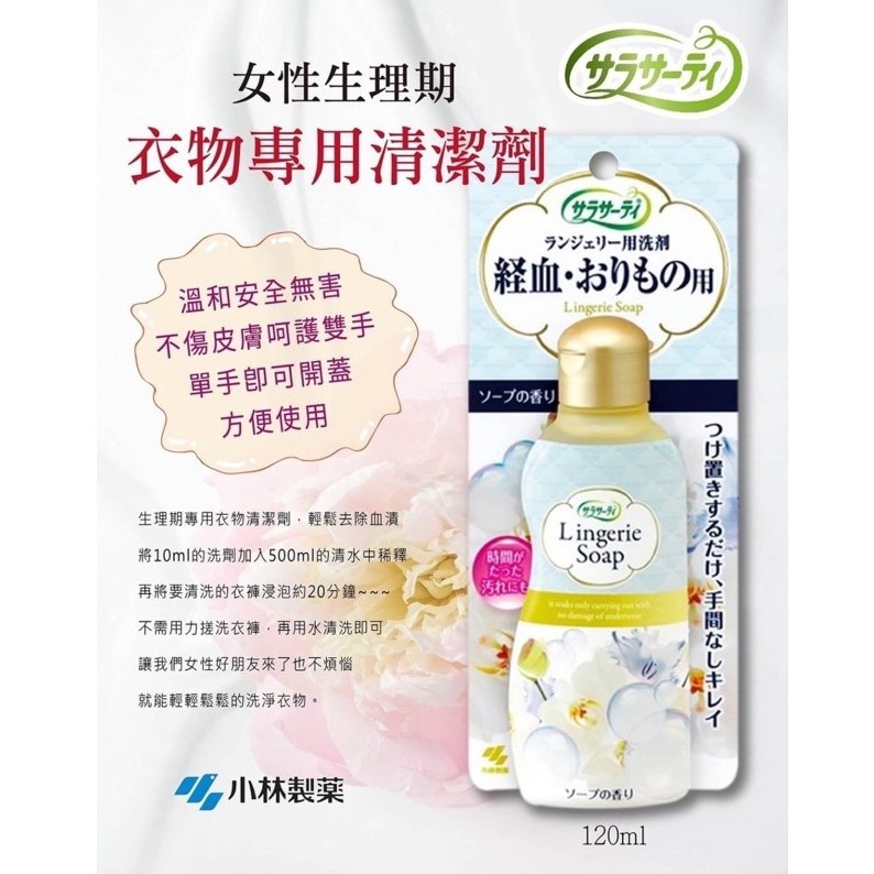 小林製藥女性生理期衣物清潔劑,含有滲透力特強的介面活性劑SAS,只需浸泡20分鐘 左右,不用大力搓洗,徹底清洗生理期血液或月經白帶所沾粘污漬~除味柔軟,不傷衣物