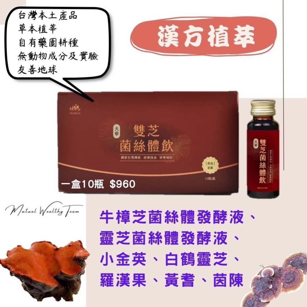 水、靈芝菌絲體發酵液(靈芝菌絲體GanodermaLucidum)、牛樟芝菌絲體發酵液(牛樟芝菌絲體Antrodiacinnamomea)、乳糖、羅漢果萃取物、白鶴靈芝萃取物、生薑萃取物、丹參萃取物、黃耆萃取物、五味子萃取物、當歸萃取物、白芍萃取物、枸杞萃取物、茵陳萃取物、小金英萃取物、甜菊醣苷(甜味劑)
