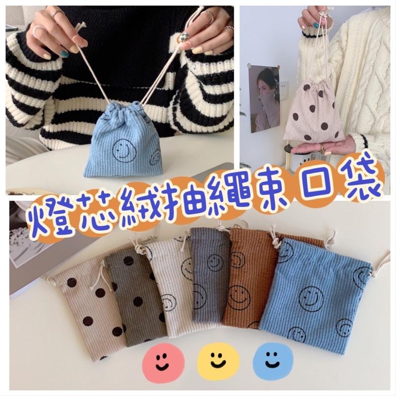 波點笑臉款燈芯絨抽繩束口袋 可愛手拎包 小布包 衛生棉包 3C包 日系 包內整理袋 禮品袋 雜物收納分類 加厚 顏色好看