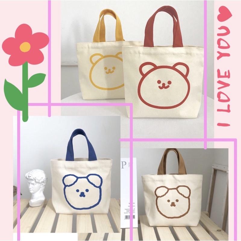 小熊造型撞色手提把Bear 五色外出簡約小提袋 小熊手提袋 手提小包 帆布包 便當包 飲料袋購物袋 野餐午餐方包ins