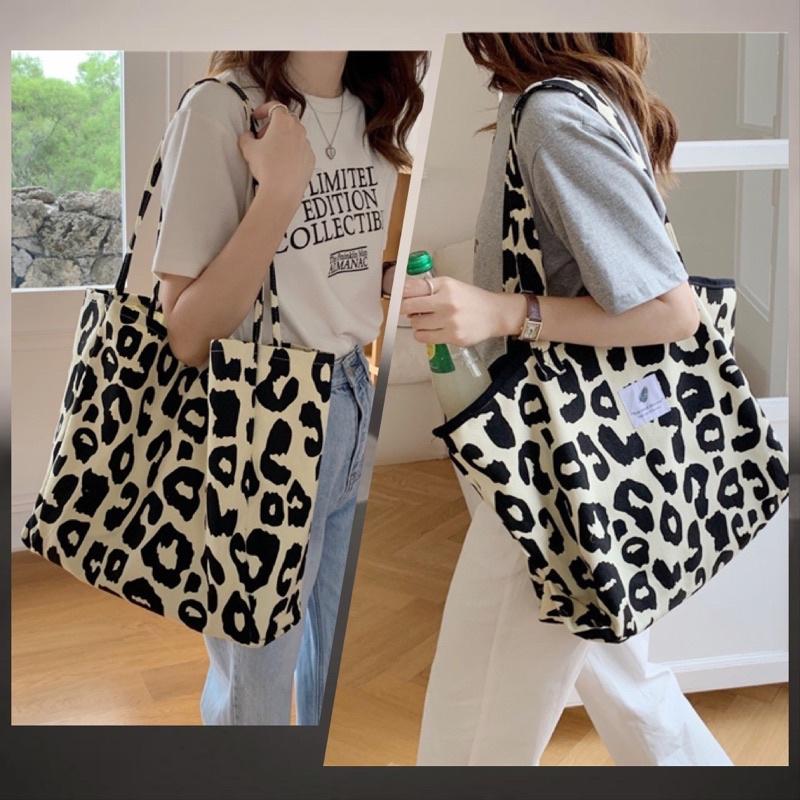 時髦個性款 米色豹紋帆布包 動物紋 單肩包 韓版包 大容量加厚帆布 托特包百搭 質感印花 上課旅行購物皆可用 有內袋收納