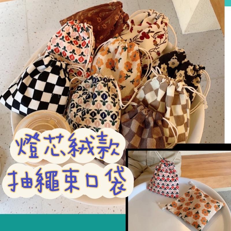 燈芯絨款印花抽繩束口袋 可愛手拎包 小布包 衛生棉包 3C包 日系大包內整理袋 禮品袋 雜物收納分類 復古風 厚帆布