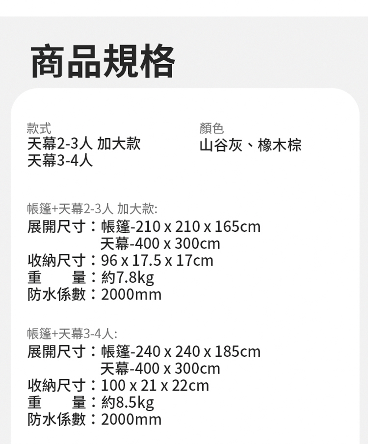 展開尺寸:●帳篷-210 x 210 x 165cm●天幕-400 x 300cm