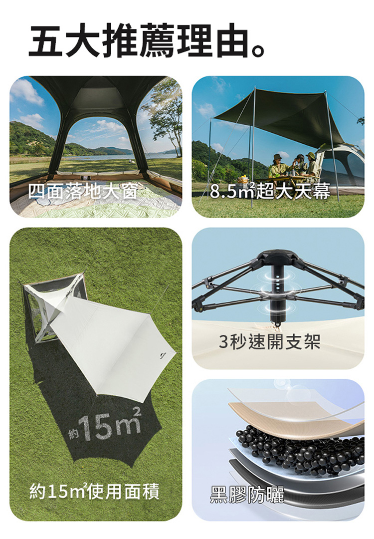 材質:●帳篷-150D牛津布黑膠塗層(100%聚酯纖維)●帳桿-玻璃纖維+鋁合金